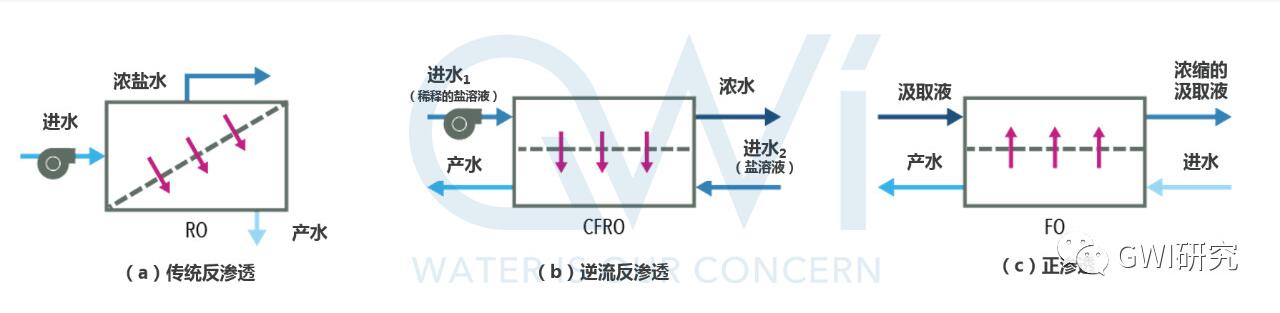 常見(jiàn)的標(biāo)準(zhǔn)RO、逆流RO和正滲透FO三者的滲透原理區(qū)別如下圖所示。而這兩項(xiàng)技術(shù)則是通過(guò)利用不同滲透壓(正滲透與反滲透)的原理,在反滲透膜出水端添加少量鹽溶液,以維持RO膜進(jìn)料端和滲透端的鹽水濃度,從而有效降低膜兩側(cè)的壓力差。通過(guò)這一新興的鹽濃縮蒸發(fā)設(shè)備和多級(jí)串聯(lián)的處理,出水濃度可高達(dá)250,000 mg/L TDS。這樣一來(lái),系統(tǒng)在進(jìn)行濃縮的同時(shí),其所消耗的外加壓力也相應(yīng)降低,同時(shí)實(shí)現(xiàn)了節(jié)能的目的。