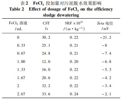 2.2 PAM 投加比為 1 /6 時,FeCl3 溶液投加量對污泥脫水性能的影響見表 2,先加入的陽離子 PAM 對污泥進行電荷中和作用,使污泥膠體脫穩(wěn)。在開始階段,一方面投加 FeCl3 發(fā)揮絮凝的作用,形成污泥絮團,在此過程中,部分結(jié)合水被轉(zhuǎn)化為自由水,使得污泥中自由水的含量升高;另一方面,由于正電荷的引入也使得 Zeta 電位不斷增大,污泥間的靜電斥力不斷減小,更利于絮體的形成。因此,開始階段污泥表面的 CST 和 SRF 不斷減小,當 FeCl3 投加量為 1 mL 時 CST 和 SRF 達到最小值,分別為12. 0 s、0. 20 × 1011 m /kg。隨后繼續(xù)增加 FeCl3 的投加量,反而導致污泥的 CST 與 SRF 回升,但是隨著陽離子的不斷引入,后階段的 Zeta 電位也是呈上升趨勢,此時由于 Fe3 + 與 PAM 中陽離子基團同電相斥,使得污泥顆粒間排斥作用加大,絮體難以凝聚,不利于污泥脫水。從藥劑節(jié)省和脫水性能優(yōu)化兩方面綜合考慮,確定 FeCl3 最佳投加量為每毫升污泥中投加 1 mL。