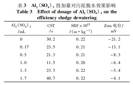 2.3 PAM 投加比為 1 /6 時,Al2 ( SO4 ) 3 溶液投加量對污泥脫水性能的影響如表 3 所示,先加入的陽離子 PAM 對污泥進行電荷中和作用,使污泥膠體脫穩(wěn)。在開始階段,一方面,投加 Al2 ( SO4 )3 發(fā)揮絮凝的作用,形成污泥絮團。在此過程中,部分結(jié)合水被轉(zhuǎn)化為自由水,使得污泥中自由水的含量升高;另一方面由于正電荷的引入,也使得 Zeta 電位不斷增大,污泥間的靜電斥力不斷減小,更利于絮體的形成。當 Al2 ( SO4 )3投加量為 1 mL 時,CST 和 SRF 達到最小值,分別為 11. 5 s、0. 21 × 1011 m /kg,隨后繼續(xù)增加 Al2 ( SO4 )3 的投加量,反而導致污泥的 CST 與 SRF 回升。由于 Al3 + 與 PAM 中陽離子基團同電相斥,使得污泥顆粒間排斥作用加大,絮體難以凝聚。但是后階段的 Zeta 電位隨著陽離子的不斷引入仍然呈上升趨勢。從藥劑節(jié)省和脫水性能優(yōu)化兩方面綜合考慮,確定 Al2 ( SO4 )3 最佳投加量為每毫升污泥中投加 1 mL。