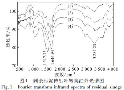 PAM、PAM 和 FeCl3 最佳投加比聯(lián)用、PAM 和 Al2 (SO4 )3 最佳投加比聯(lián)用,分別處理污泥,不同投加條件下剩余污泥傅里葉轉(zhuǎn)換紅外光譜圖見圖 1。