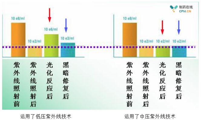 從理論方面談,細菌、病菌和病毒長期暴露在太陽光下面(日光中包括紫外線),幾千年的時間,這些細菌、病菌和病毒必然產(chǎn)生對紫外線產(chǎn)生一些抗體,這種抗體在這里被人們稱為活化酶。活化酶存在于細菌和病菌的細胞內(nèi),一旦細菌和病菌的DNA 受到損傷,這種活化酶就會發(fā)揮功效,幫助受損部分迅速恢復(fù)成原來的狀態(tài)。這樣一個反應(yīng)過程被稱為細菌和病菌的復(fù)活反應(yīng),在有光的情況下此種反應(yīng)能進行的非常迅速 ,但同時也會發(fā)生在黑暗的狀況下。而多譜段中壓紫外線在作用于細菌和病菌的DNA 和RNA 的同時,也作用于這種活化酶,理論上有可能徹底殺滅生長狀態(tài)的微生物 。實際試驗數(shù)據(jù)也證明了這種理論,2002 年加拿大科學(xué)家曾經(jīng)在實驗室做個這樣一個對比試驗,如圖(4)試驗在完全相同的經(jīng)低壓和中壓紫外線照射后微生物的光復(fù)活的對照試驗