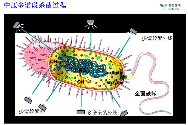 微生物結(jié)構(gòu),微生物的體內(nèi)都含有RNA(核糖核酸)和DNA(脫氧核糖核酸),而RNA和DNA的共同特點是具有由磷酸二酯按照嘌呤與嘧啶堿基配對的原則相連的多核酸鏈,它對紫外光具有強烈的吸收作用。紫外線殺菌的原理一般認為它與破壞細胞內(nèi)代謝、遺傳、變異等現(xiàn)象起著決定性作用的核酸相關(guān),波長在200~300nm之間的紫外線有殺滅作用,其中以254nm波長的紫外線滅菌效果最好。這是因為細胞中的DNA(脫氧核糖核酸)核蛋白的紫外吸收峰值正好在254~257nm之間⑶。
