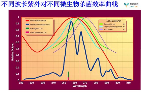 微生物經(jīng)中壓紫外線照射后不僅破壞DNA還破壞其他組織不同波長紫外線對不同微生物殺菌效率曲線